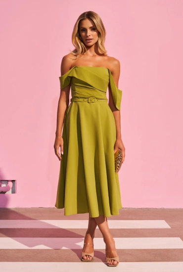 Noelia - Zielona sukienka midi z asymetrycznym krojem, ozdobnym rękawem i szarfą