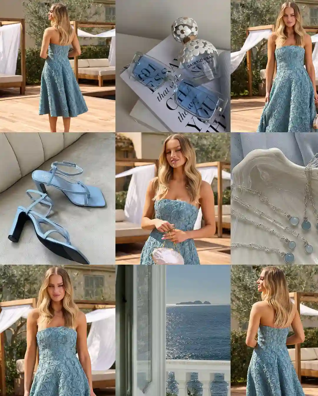 Gorsetowa sukienka midi na fiszbinach. Gorset posiada gumę z haftkami, dzięki czemu sukienka się nie zsuwa. Całość podszyta jest podszewką z wiskozy. Sukienka posiada dopinane ramiączka i zapinana jest na zamek.