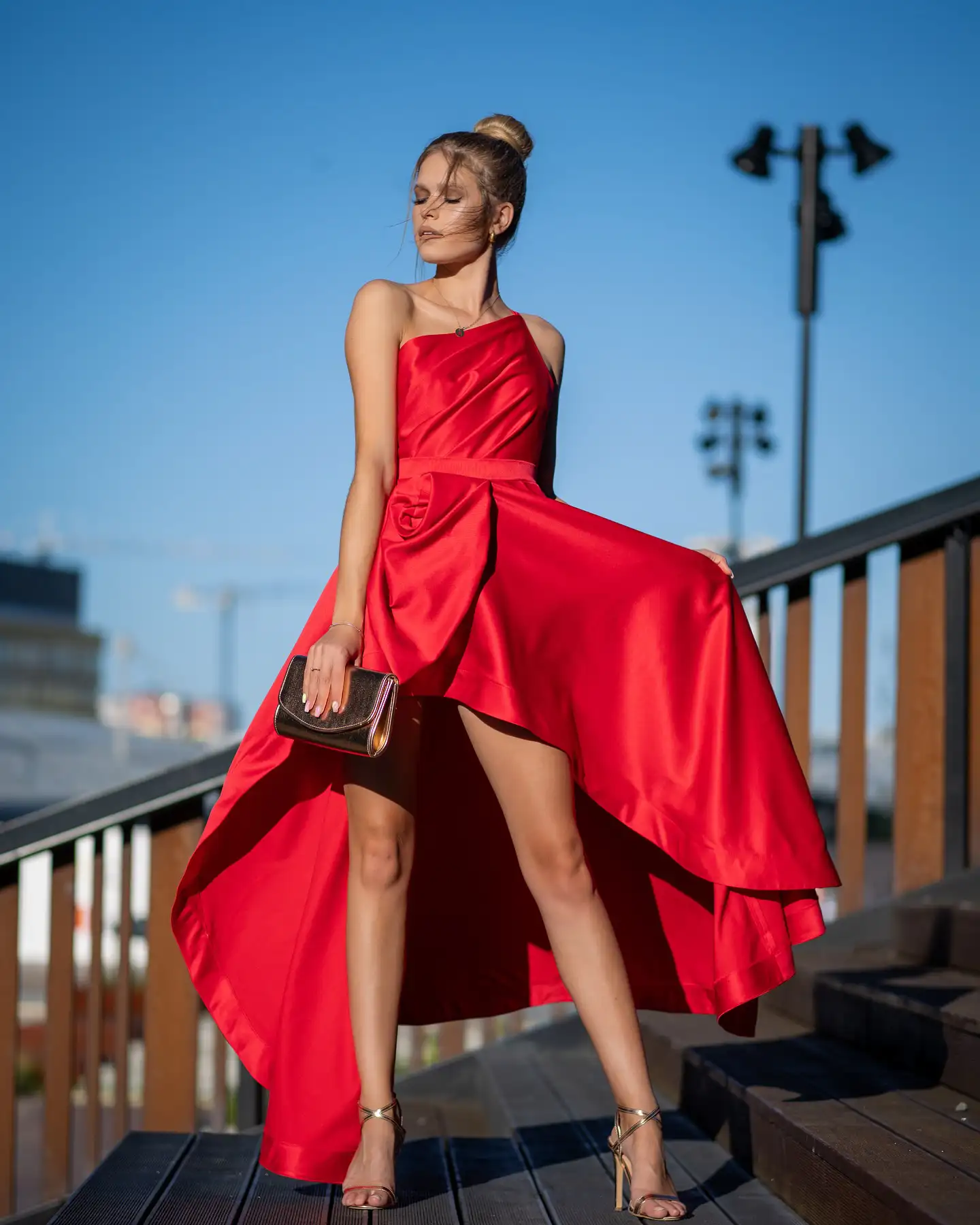 Ta wyjątkowa sukienka, zaprojektowana z asymetrycznym dekoltem dodającym elegancji i nowoczesności, stanowi idealne połączenie klasyki z nowoczesnymi trendami.Górna część sukienki jest dopasowana, co pięknie podkreśla sylwetkę, a jednostronne ramiączko dodaje subtelnej zmysłowości. Co więcej, ramiączka z tyłu są odpinane, co ułatwia zakładanie sukienki, zapewniając zarazem możliwość dostosowania jej do własnych preferencji. Dół sukienki jest rozkloszowany i wyposażony w krynolinę, która zapewnia piękny kształt i objętość, tworząc przy tym fantazyjny kwiat poniżej talii, co dodaje sukience unikalnego charakteru.