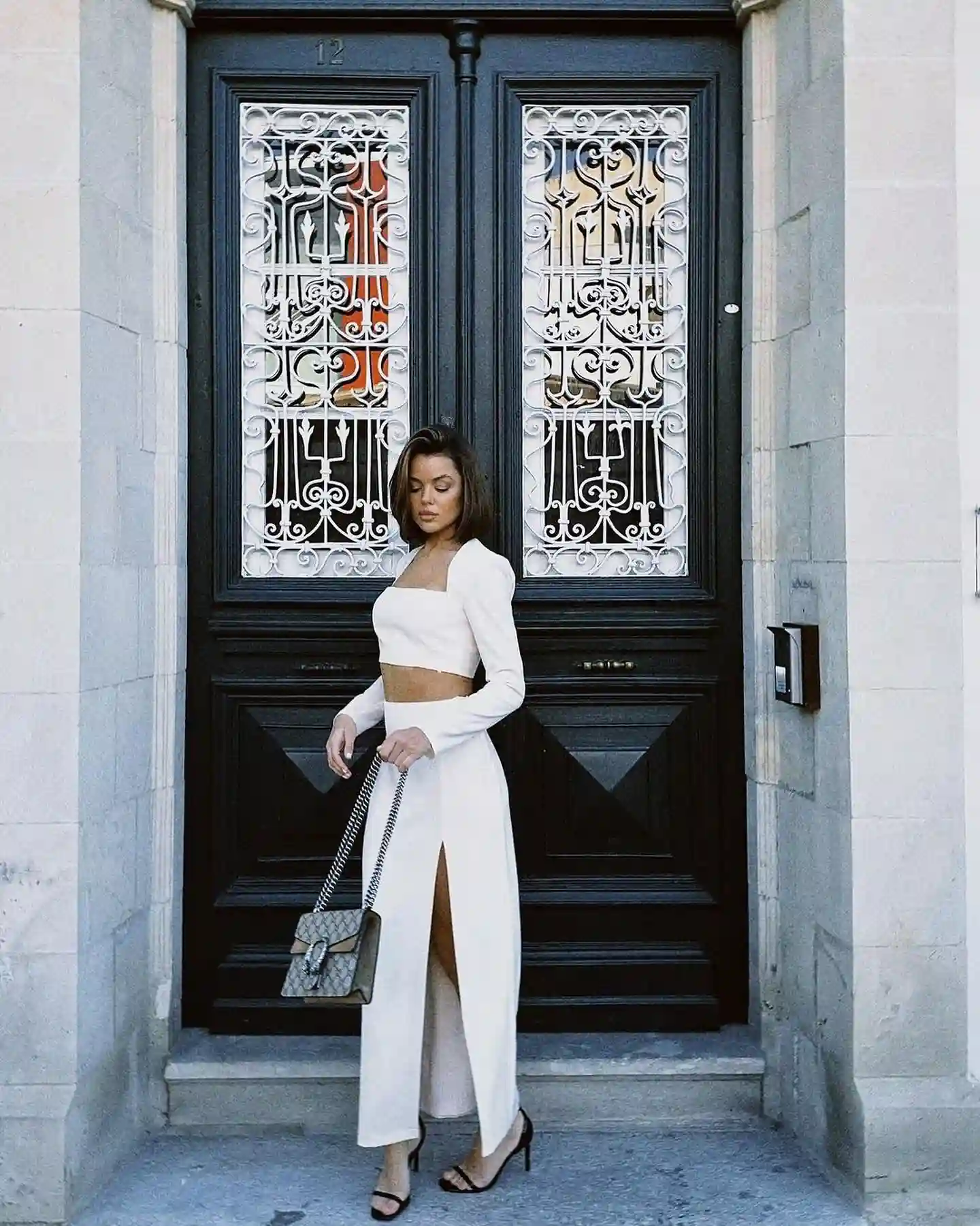 Elegancki i wyjątkowy kremowy komplet Anuari to doskonały wybór na wyjątkowe okazje, takie jak święta, chrzest, komunia czy ślub. Top gorsetowy, zapinany na zamek, podkreśla sylwetkę, dodając stylu i elegancji. Dekolt trapezowy nadaje całości subtelności, a długi rękaw dodaje klasy.Spódnica ołówkowa o długości maxi z rozporkiem jest idealnym dopełnieniem zestawu. Wykonana z wysokiej jakości tkaniny, zapewniającej komfort noszenia, prezentuje się niezwykle gustownie. Zarówno top, jak i spódnica posiadają podszewkę wykonaną z tej samej tkaniny, co dodaje im harmonii i sprawia, że całość wygląda perfekcyjnie.