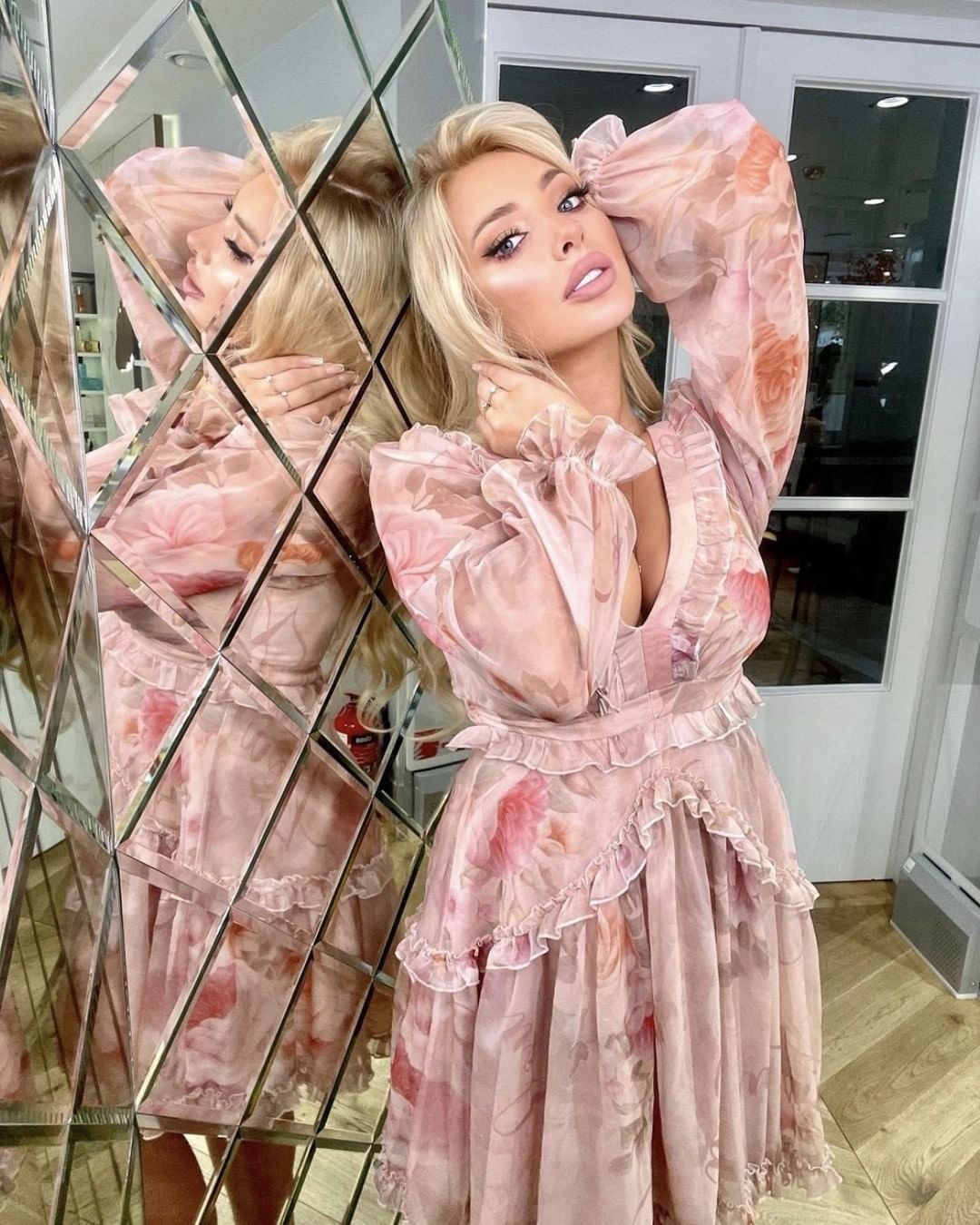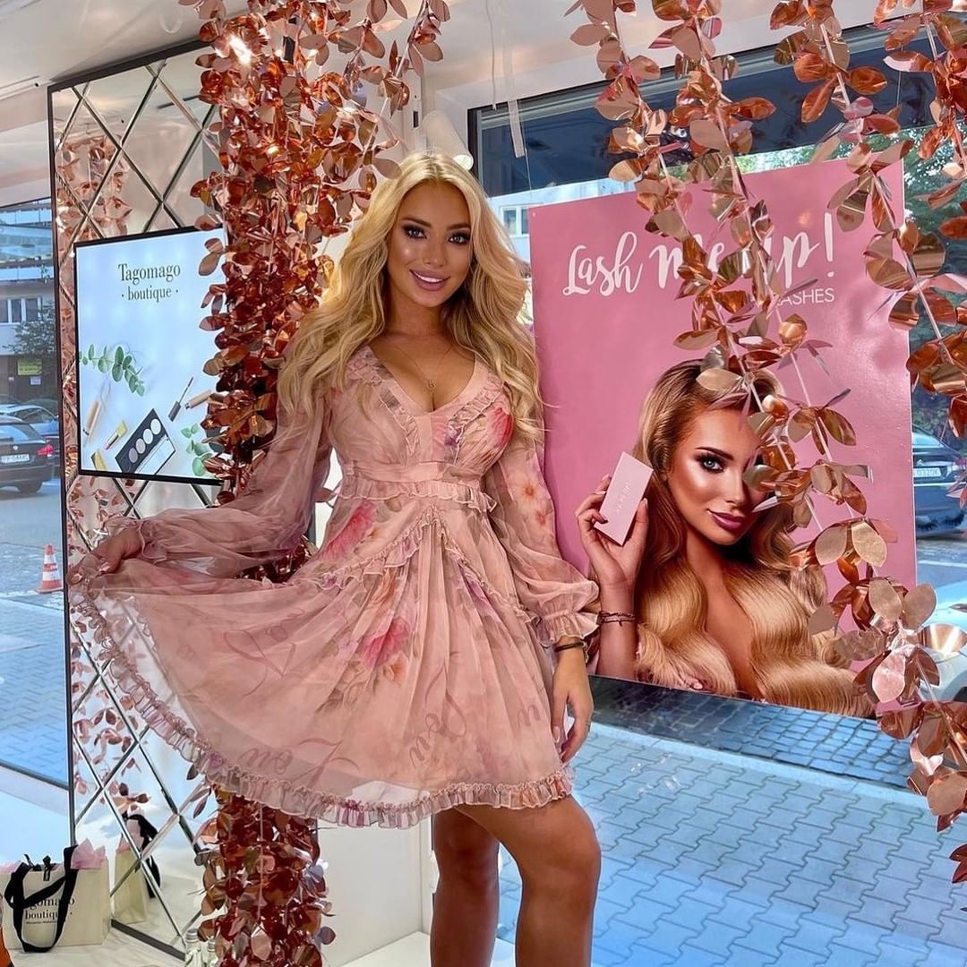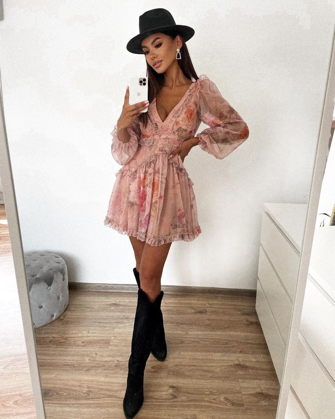 Sukienka mgiełka z kwiatowej tkaniny z wplecionym logowaniem. Całość utrzymana w tonacji przydymionego różu. Sukienka Brooke to jedna z tych sukienek , która oczarowuje przy pierwszym spotkaniu. Dekolt w kształcie litery "V" pięknie eksponuje kształty, a poszerzane, luźne rękawy dodają lekkości. Uroczyste spotkanie czy po prostu romantyczna kolacja z Twoim udziałem w tej koktajlowej sukience to niezapomniane chwile. Sukienka rewelacyjnie współgra z sandałami na słupku i skromną łańcuszkową biżuterią.InstagramZobacz tę stylizację na Instagramie