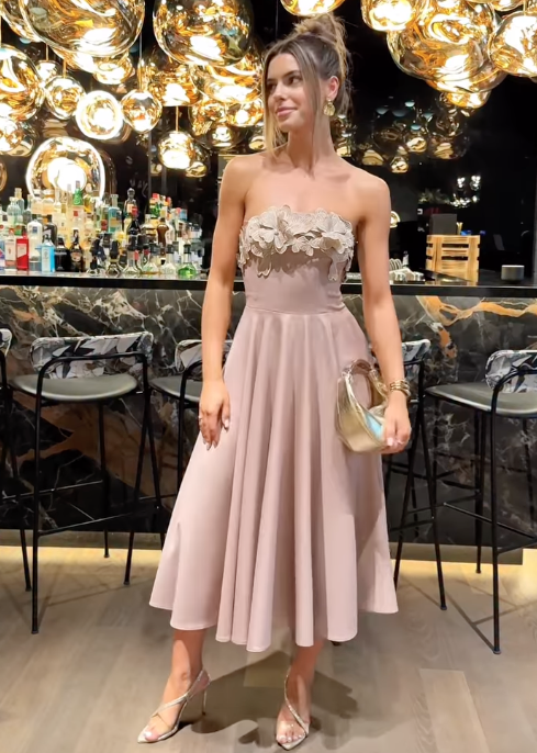 Cosala - gorsetowa midi z kwiatowym zdobieniem w odcieniu latte