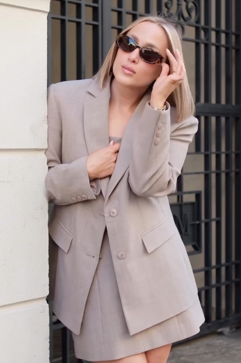 Beżowa marynarka z tkaniny z wełna dziewiczą. Posiada poduszki na ramionach, logowane guziki oraz haftowane logo na rękawie. Doskonale tworzy komplet ze spódniczką i topem Djihene.