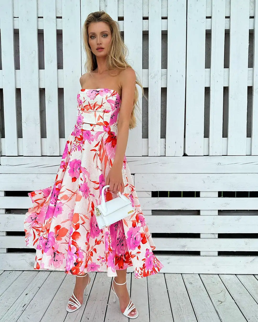 Elegancki komplet spódnica + bralet w kwiatowy wzór. Gorset na fiszbinach, midi spódnica, dekolt gorsetowy, aplikacja kwiatowa, zamek błyskawiczny. Śliski materiał, bez rękawów. Letni/wiosenny styl.