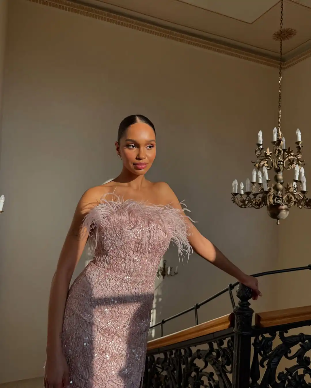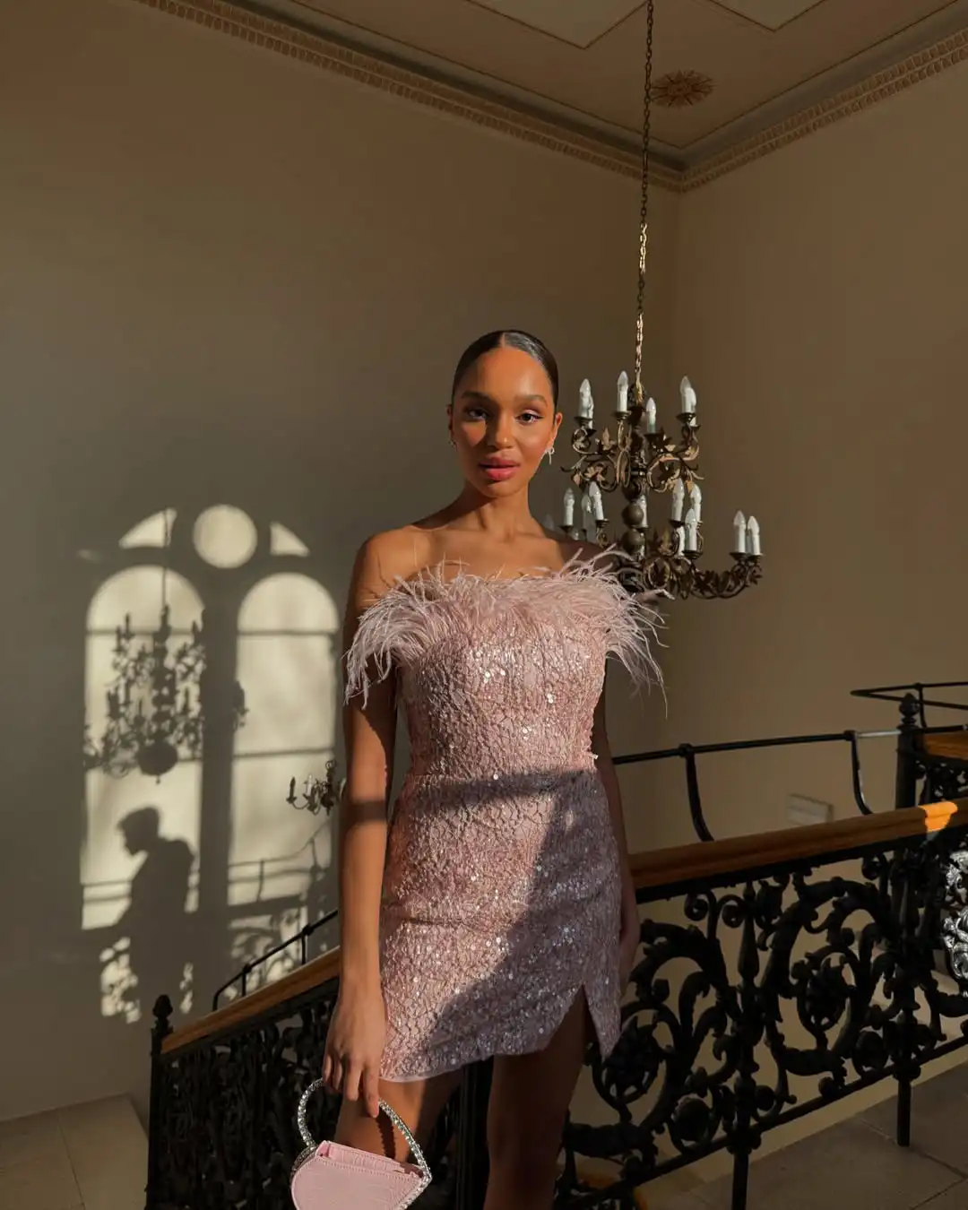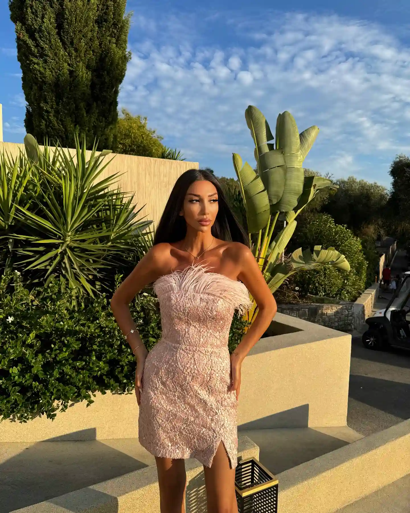 Mini sukienka z gorsetem, wykończonym piórami. Posiada regulowane szelki.