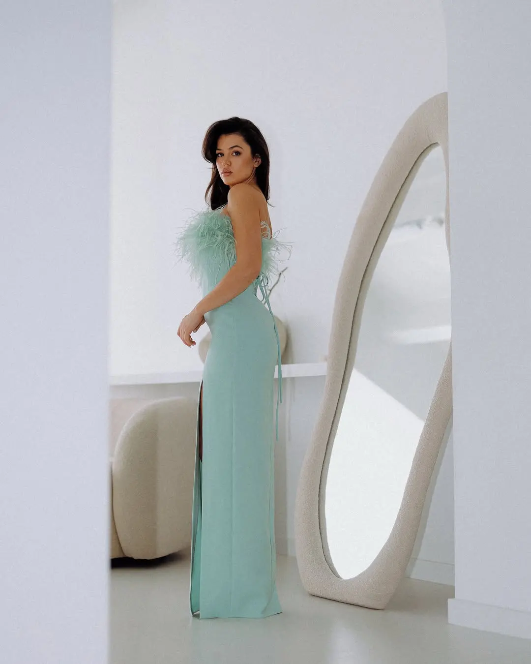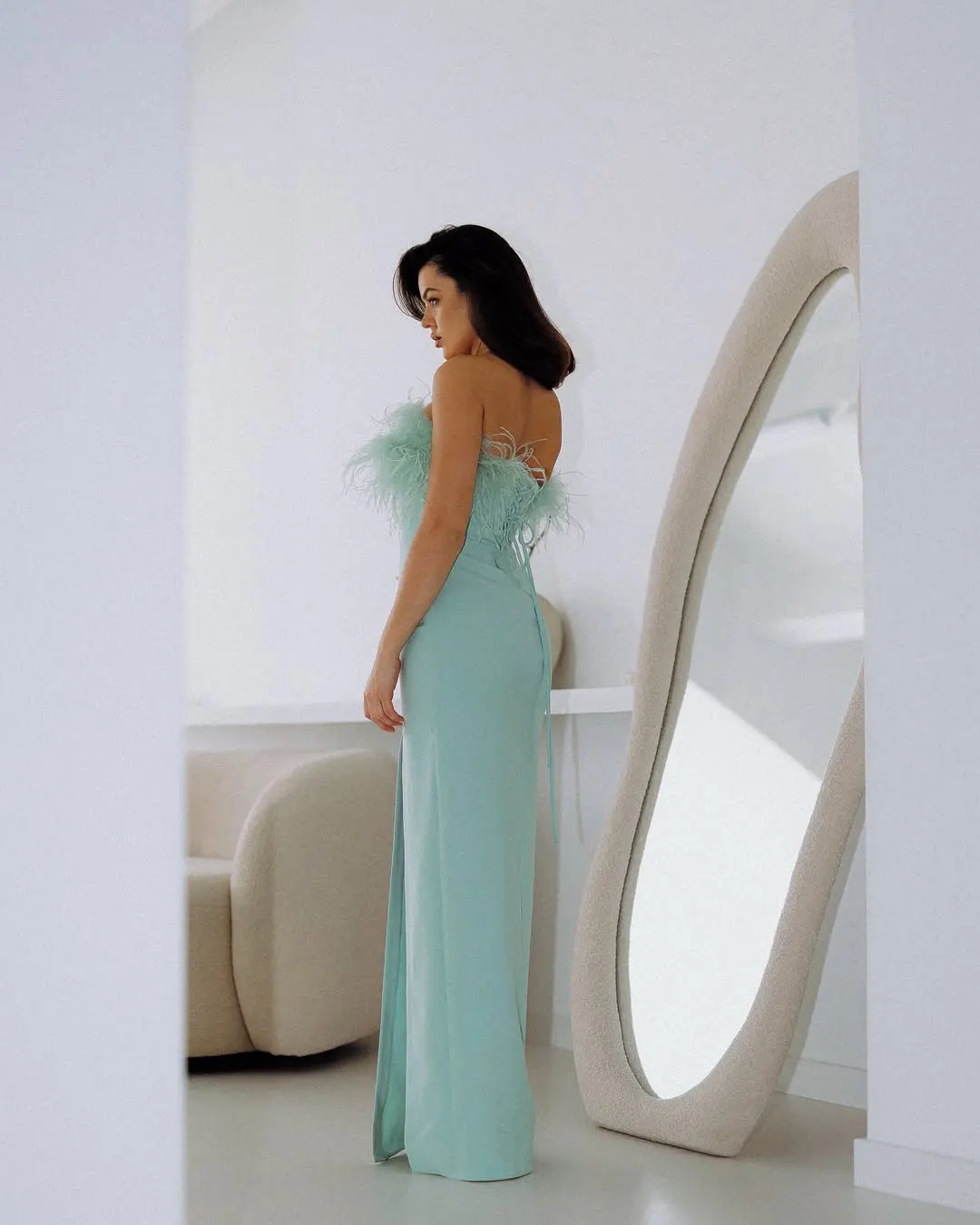 Sukienka gorsetowa na fiszbinach. Wykonana jest z delikatnie rozciągliwej tkaniny z domieszką wiskozy. Gorset posiada gumę z haftkami, dzięki czemu dobrze trzyma biust. Wiązanie na plecach oraz zamek ułatwiają zakładanie i umożliwiają regulację.