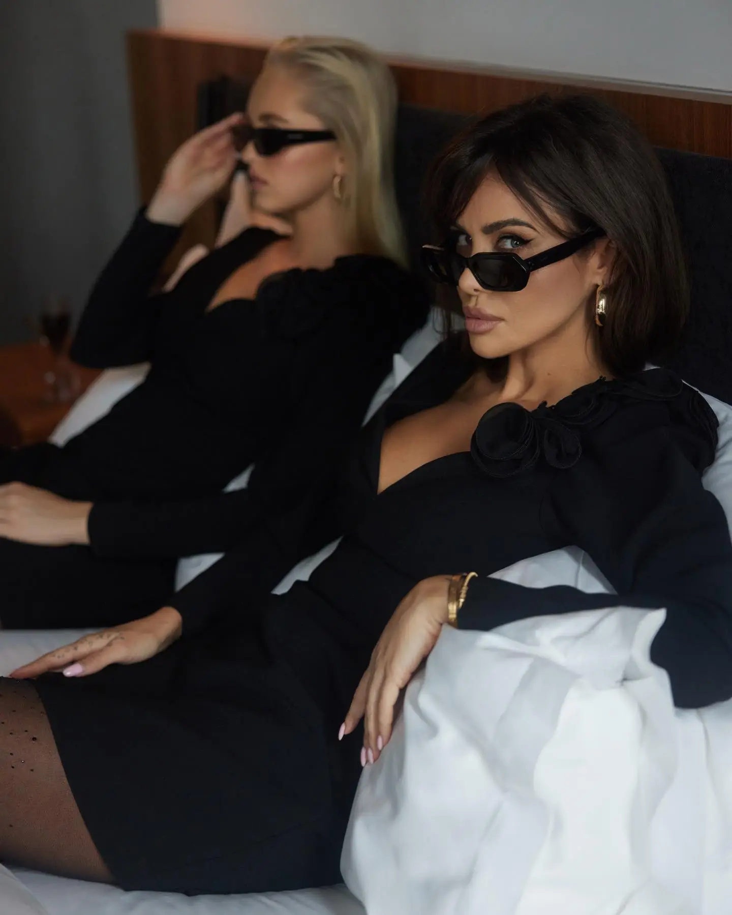 Ta czarna sukienka mini z ozdobną aplikacją na ramieniu to doskonały wybór na różne okazje, od randek po uroczystości. Długi rękaw z bufkami i dekoltem w kształcie V nadają elegancji.