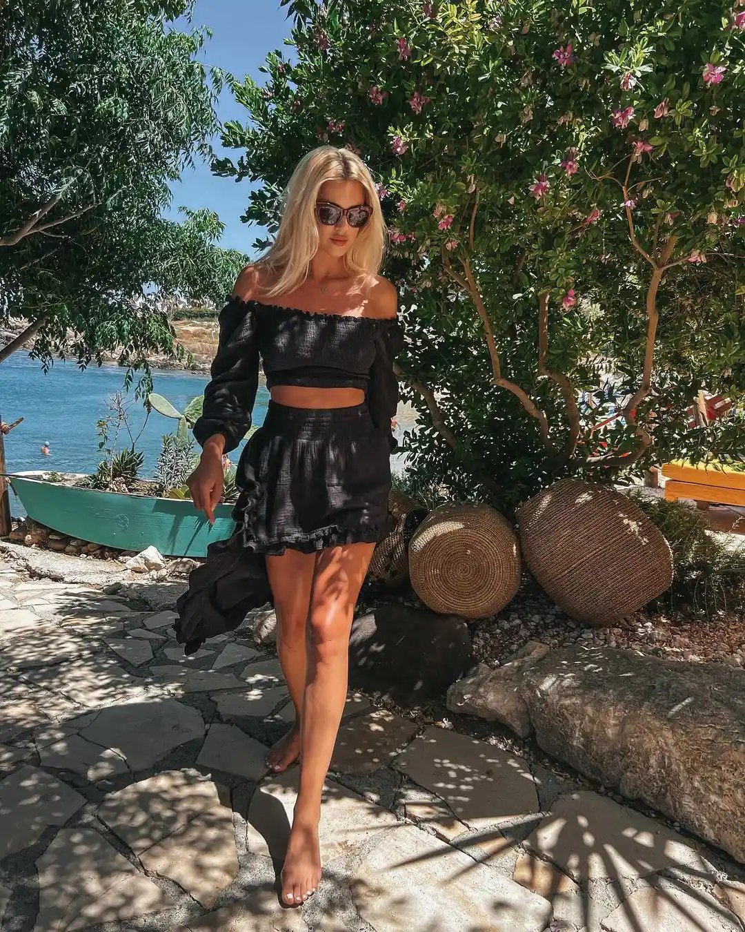 Propozycja dla miłośniczek mocnego koloru. Długie rękawy i maxi długość spódnicy to znakomita baza do uszlachetnienia wzoru falbankami i zastosowaniem krótszego przodu. Komplet Amber Czarny to must have do walizki na wakacyjny wyjazd. Praktyczny materiał w użytkowaniu i zwracający uwagę komplet w nieustannie topowym charakterze boho. Wśród sukienek i kompletów boho również sety w innej kolorystyce. Zapoznaj się naszymi akcesoriami , może ozdobna opaska na włosy lub kapelusz dla odważniejszej stylizacji.InstagramZobacz tę stylizację na Instagramie