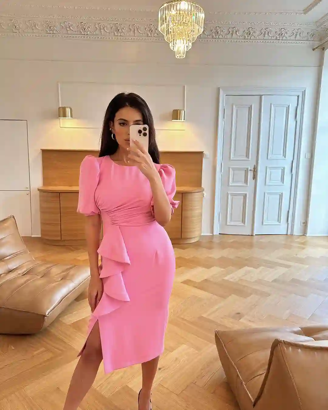 Zjawiskowa sukienka w odcieniu pudrowego różu z ozdobnym godetem na nodze i rękawami pufkami. Dekolt okrągły, zamek błyskawiczny, asymetryczna, letnia i elegancka. Idealna na święta, randki, komunie czy wesele.