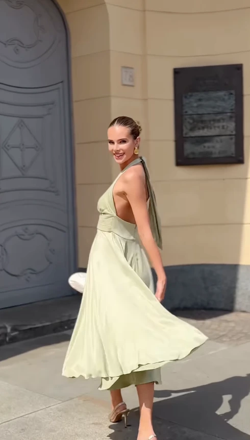 Sukienka midi o luźnym kroju z wiązaniem na szyi. Wykonana z tkaniny lyocell i wiskozy. Sukienka zapinana na zamek.