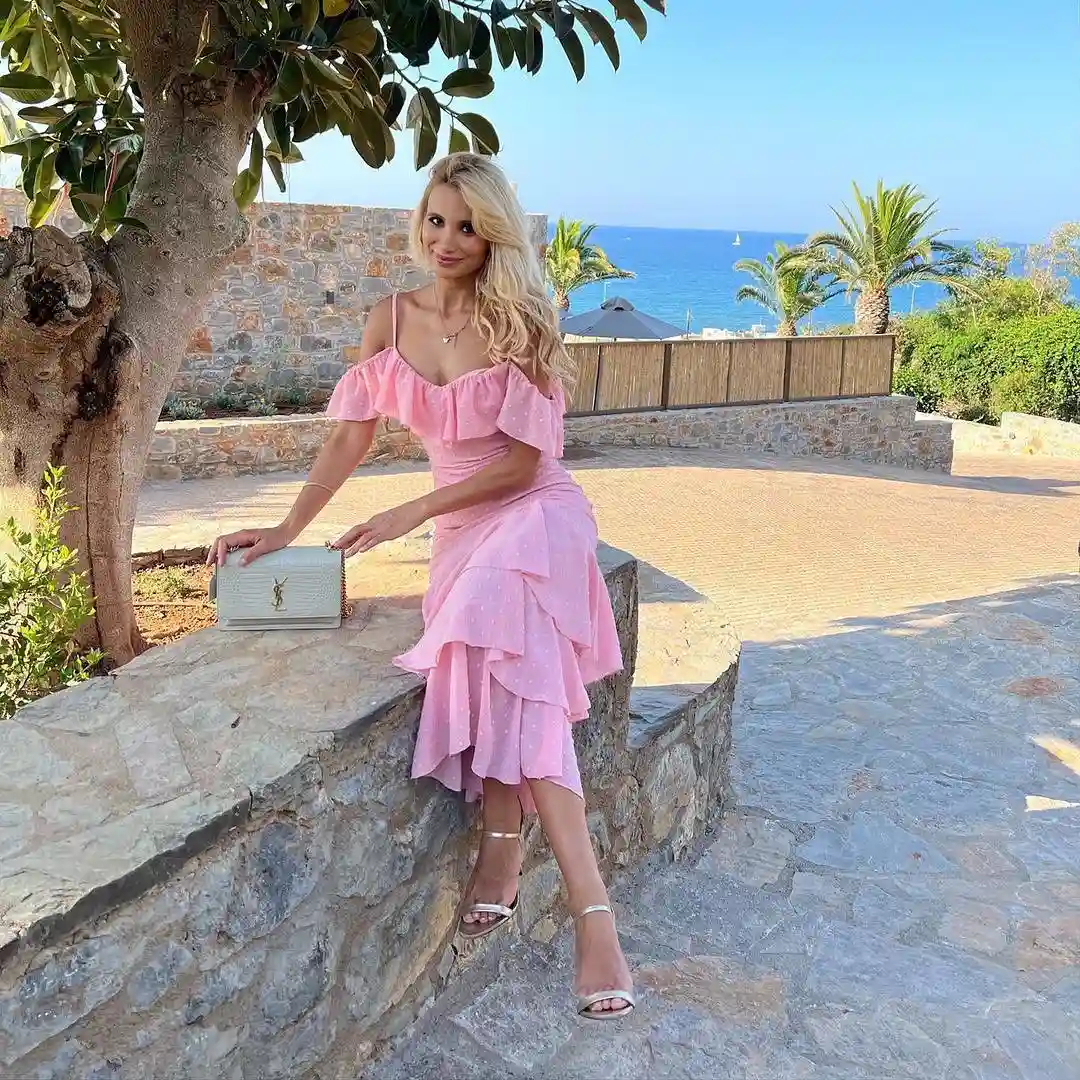 Ta sukienka maxi w odcieniu różowego koloru z hiszpańskim dekoltem jest idealnym wyborem dla kobiet poszukujących subtelności i elegancji. Jej falbany na dole dodają lekkości i ruchu, a materiał, z którego została wykonana, jest przewiewny i oddychający. Lucette posiada wyjątkowy wzór z wytłoczeniami, który nadaje jej unikalnego charakteru. Dzięki odkrytym ramionom, podkreśla delikatne piękno kobiecej sylwetki. Ta pastelowa sukienka sprawdzi się doskonale na wieczorne wyjścia czy romantyczne spotkania. Dodaj uroku i klasy swojej stylizacji dzięki tej urokliwej sukience maxi w modnym różowym kolorze.InstagramZobacz tę stylizację na Instagramie