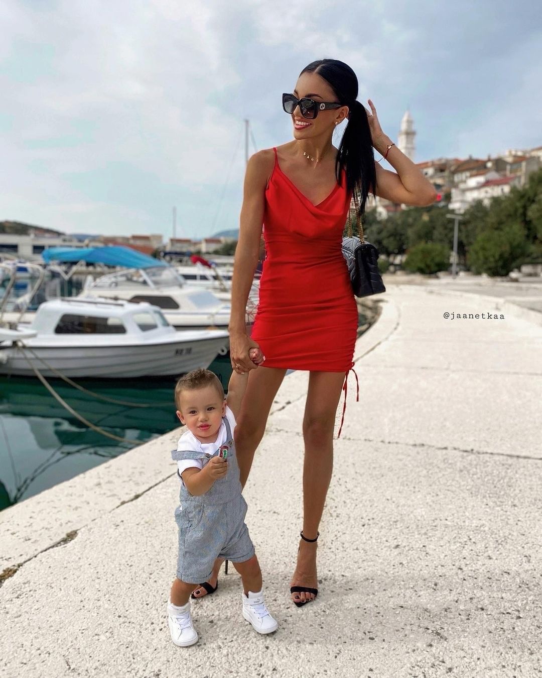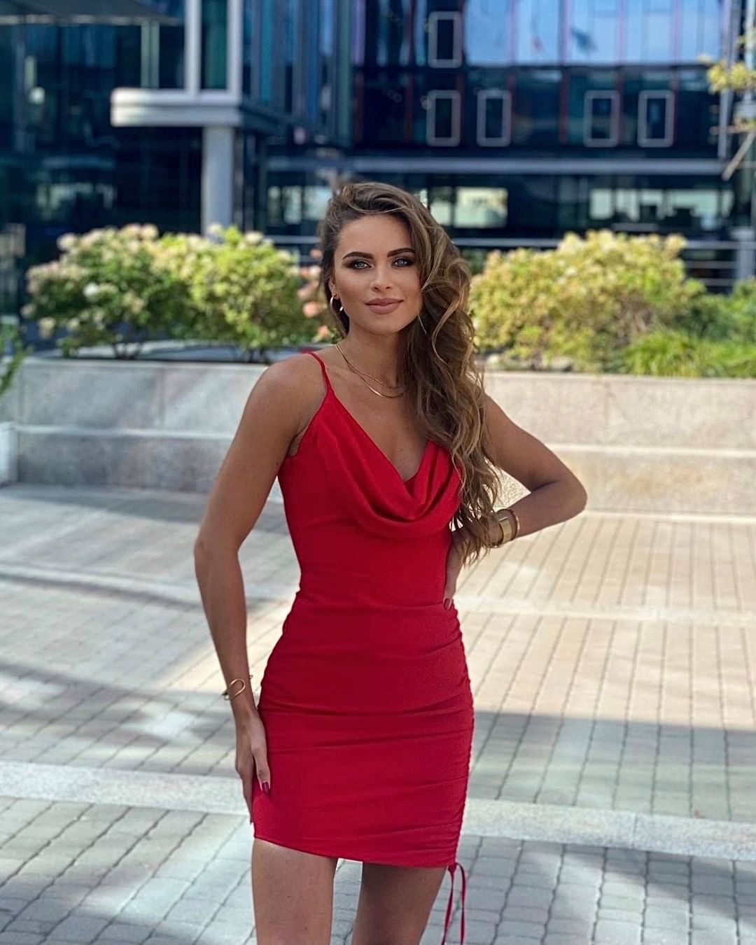 Czerwona mini z luźnym dekoltem i dekoracyjnym ściąganiem po bokach.