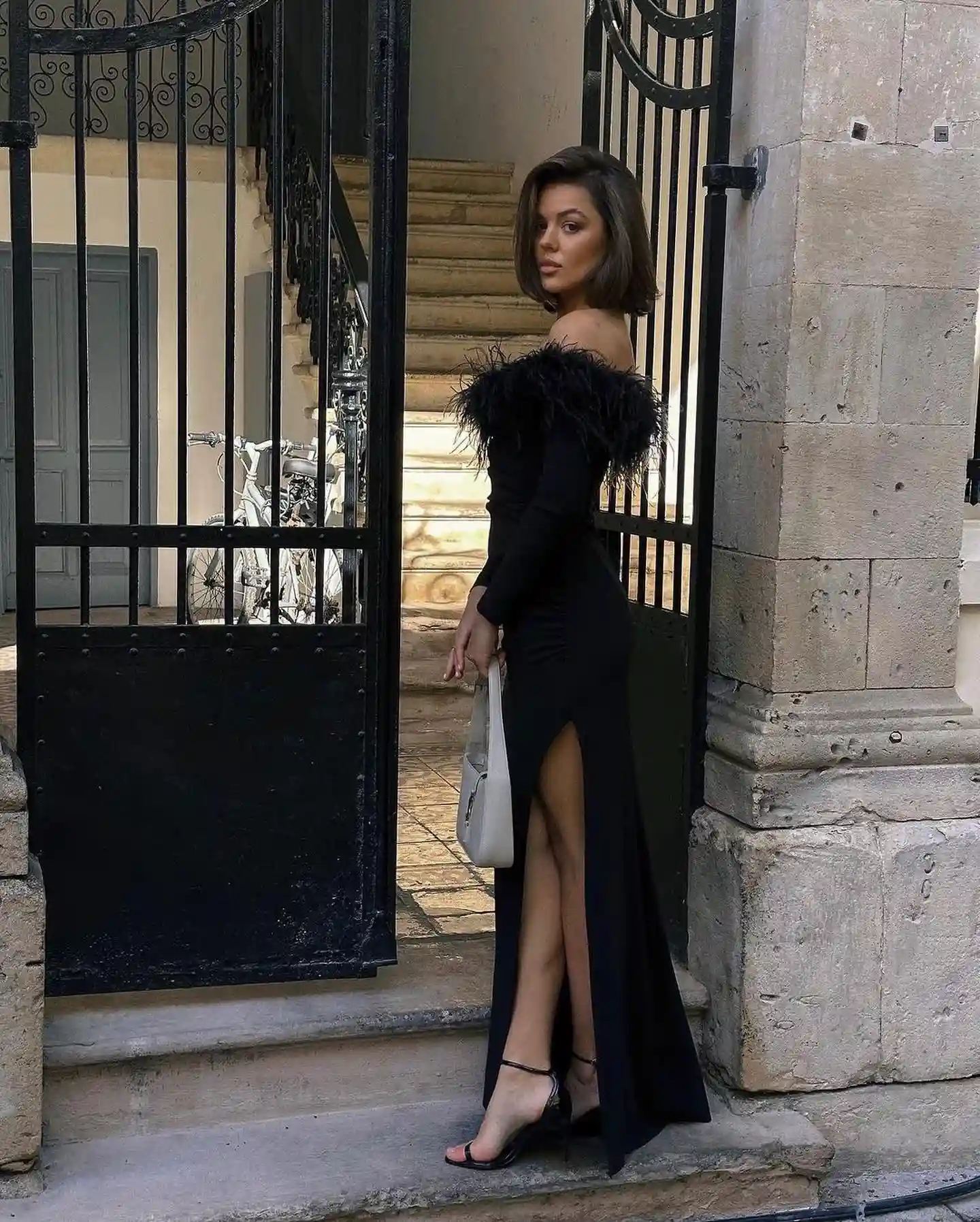 Pióra boa wokół dekoltu z przodu i z tyłu dodają sukience wyjątkowego blasku i luksusowego wykończenia. Prosty fason sukienki pięknie podkreśla nogi i biodra, sprawiając, że poczujesz się pewnie i zachwycająco.