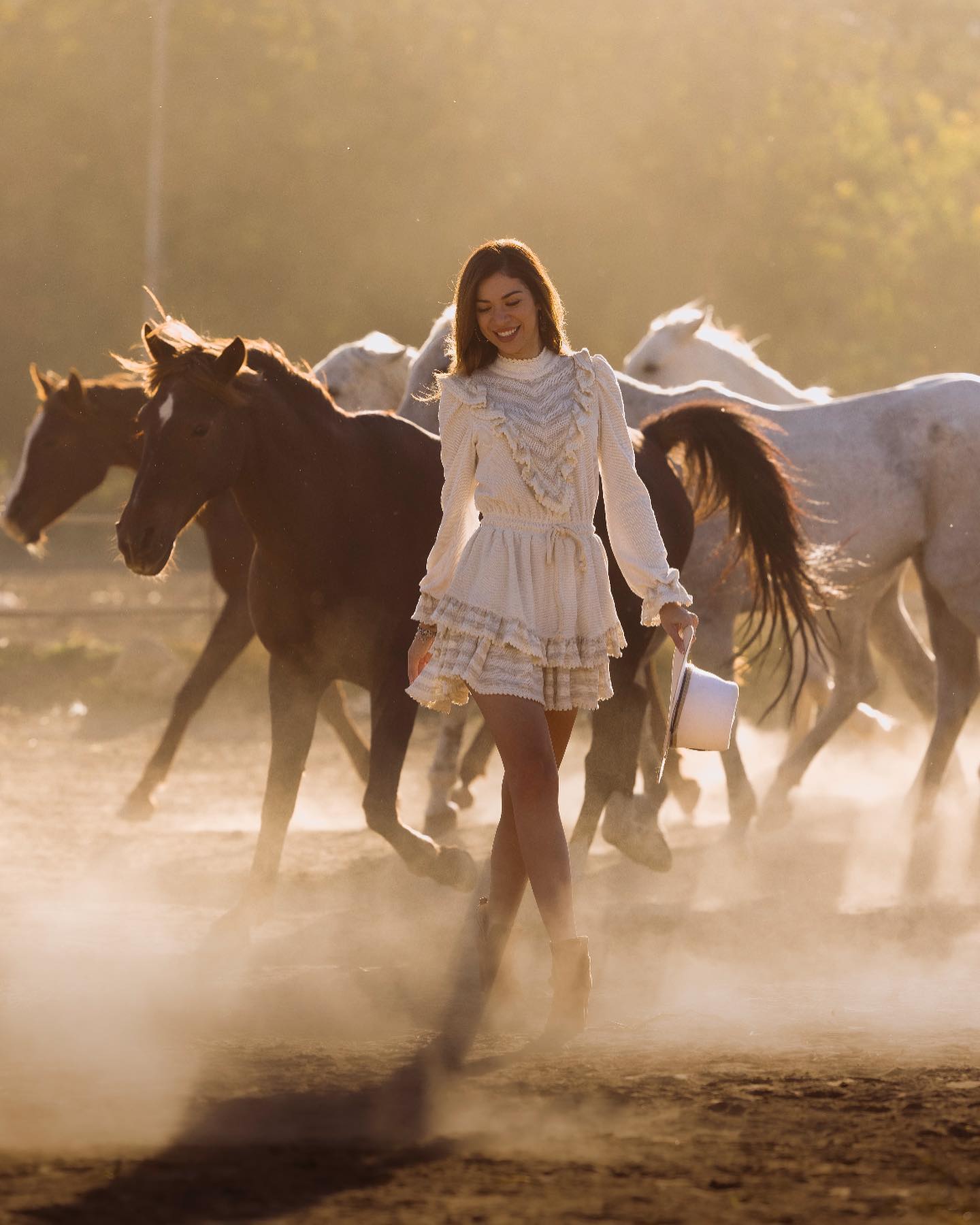 Nieprzeciętna sukienka casualowa w odcieniu ciepłego beżu. Kształt zabudowany na stójce, z długimi rękawami. Mistrzowskie połączenie gładkiej materii z tasiemkami i sznurkiem w talii. Wszystko to w identycznej palecie kolorystycznej. Zastosowane falbanki to już znak rozpoznawczy marki Lou. Sukienka Nevada robi wrażenie i z pewnością będzie to trafiony zakup. Kozaki, kowbojki, kapelusze, opaski na włosy . Wszystkie te dodatki będą dobrane w punkt do tej stylizacji.