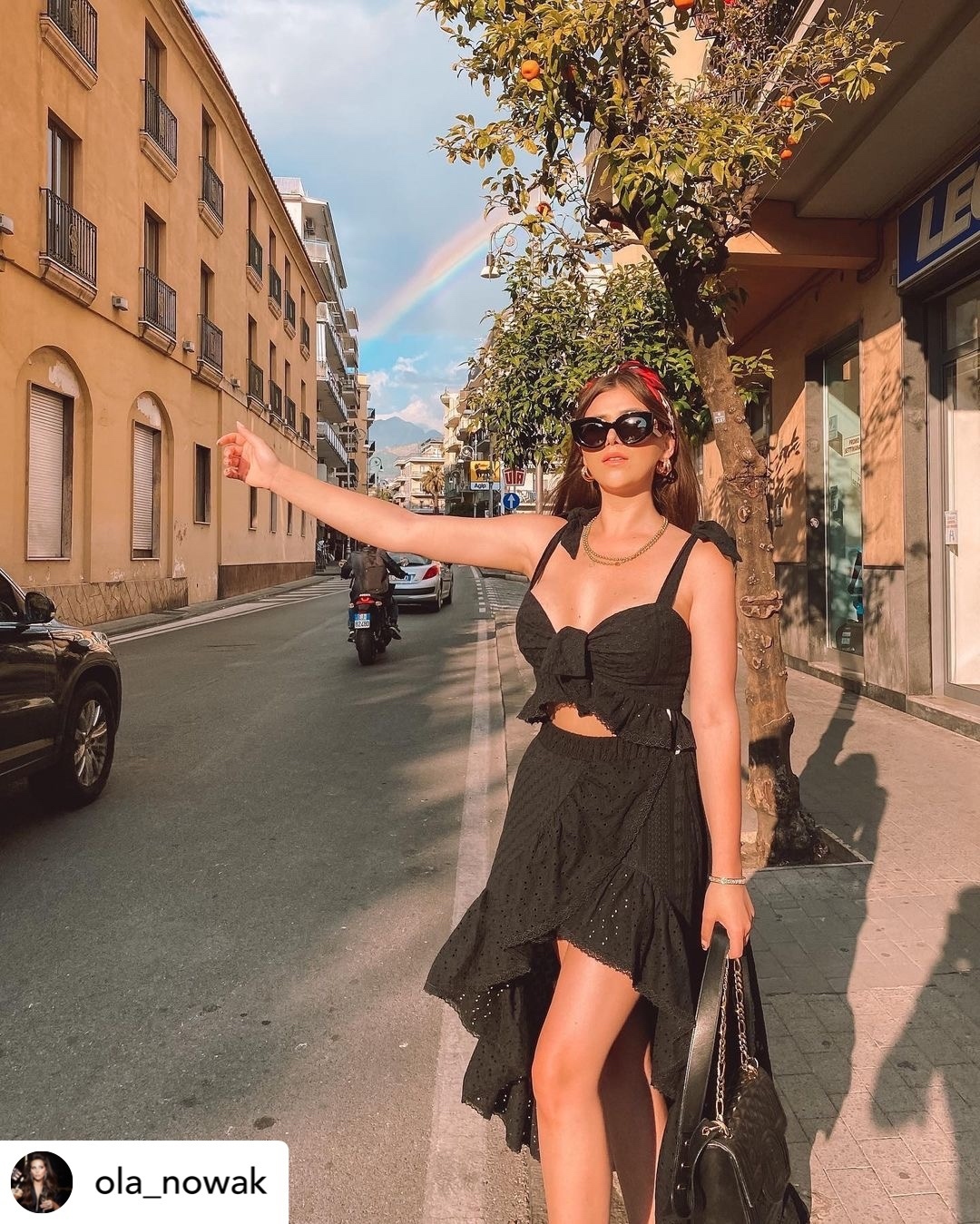 Porywający komplet dwóch boho elementów. Krótki top na ramiączkach z finezyjnym wiązaniem plus długa asymetryczna spódnica z falbanami. Haft w głębokiej czerni znakomicie kreuje ten model Peggie. Odsłonięte zalotnie nogi i ramiona dodają szczyptę fantazji każdej wakacyjnej wyprawie. Załóż ten set z kapeluszem z naszych akcesoriów i pełna entuzjazmu wyruszaj w poszukiwaniu wspomnień. Wśród odlotowych nowości zerknji na sukienki boho