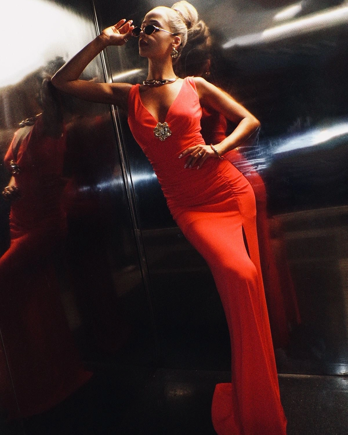 Maxi sukienka z drapowaniami, lekko rozszerzanym dołem i ozdobną, odpinaną broszką. Uszyta z podwójnej, elastycznej tkaniny. Zapinana na zamek.