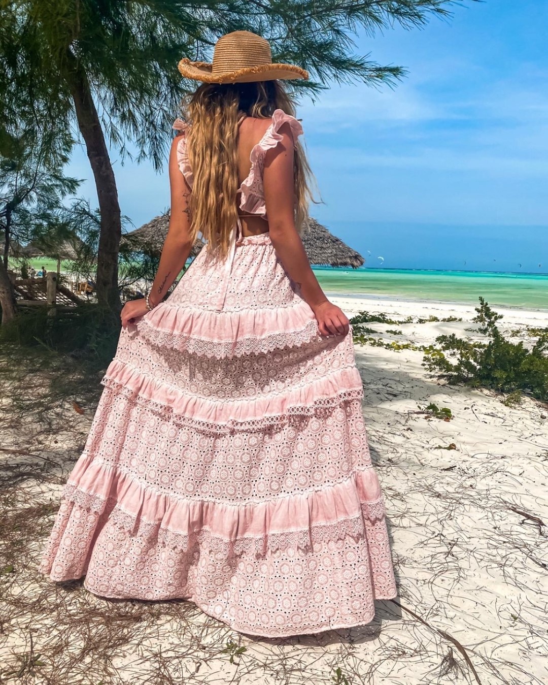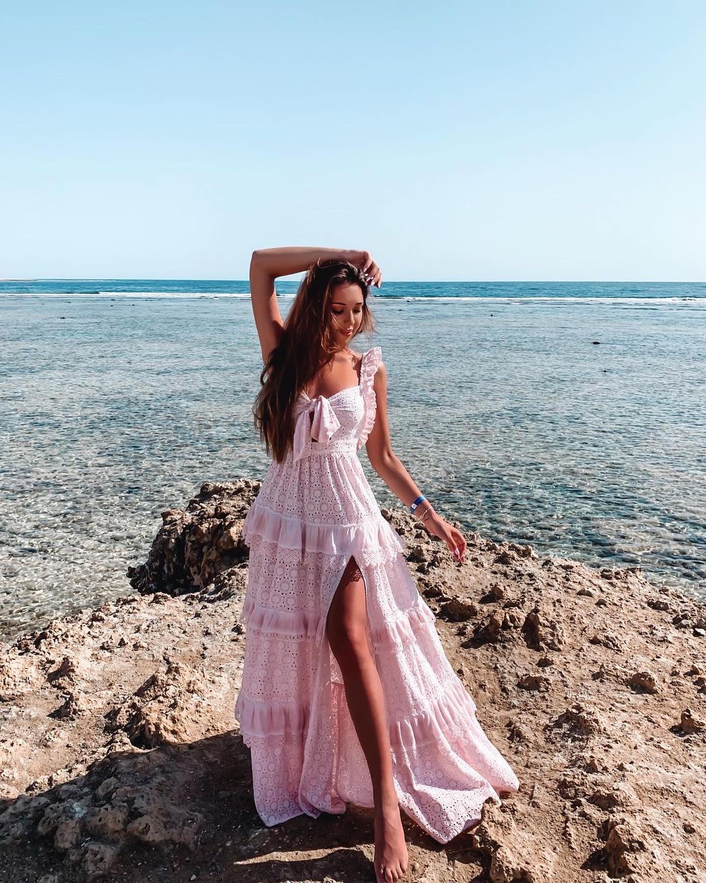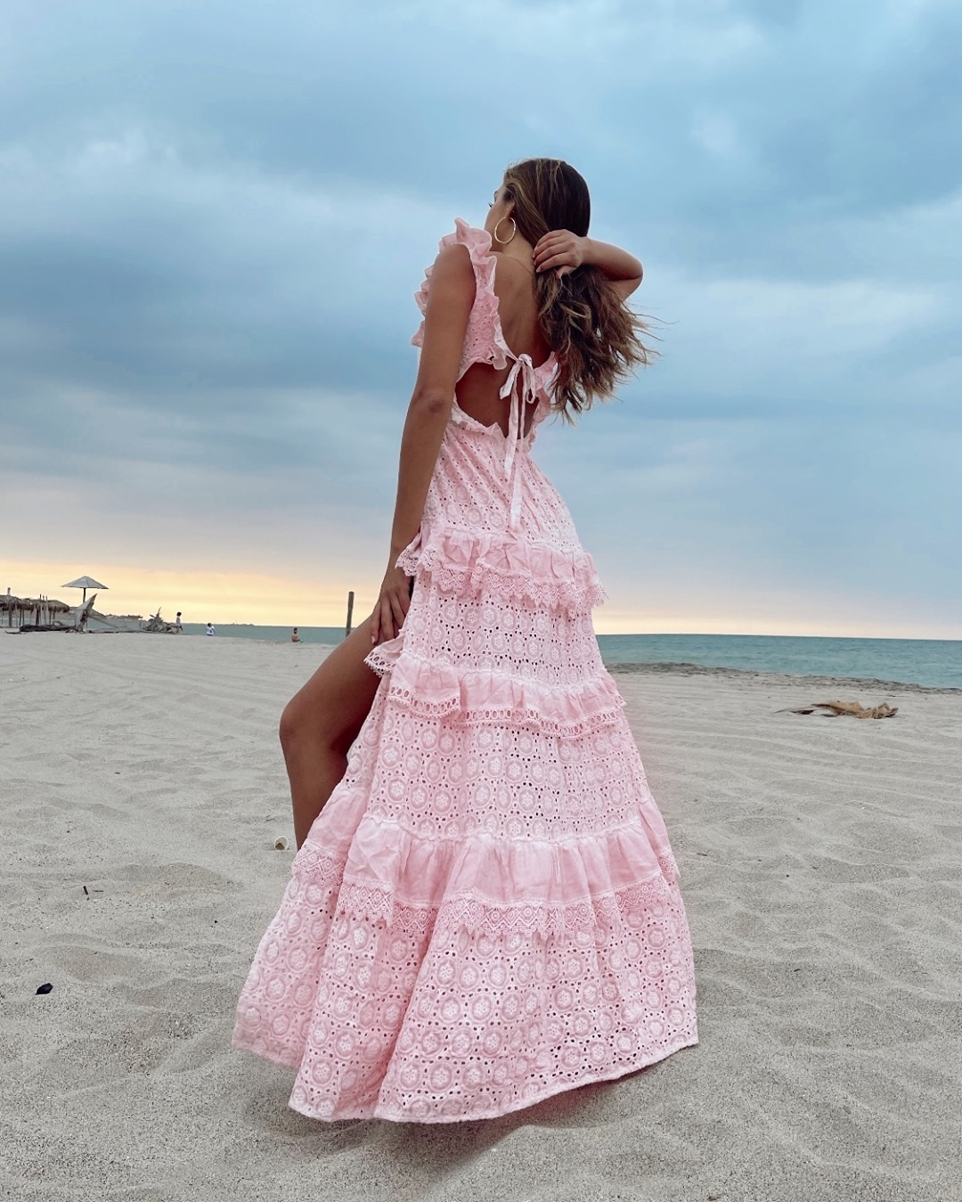 Suknia o długości maxi z ażurowej tkaniny w odcieniu różu. Sukienka z gustownym wycięciem pod biustem oraz spódnicy, która pozwoli wyeksponować nogi.