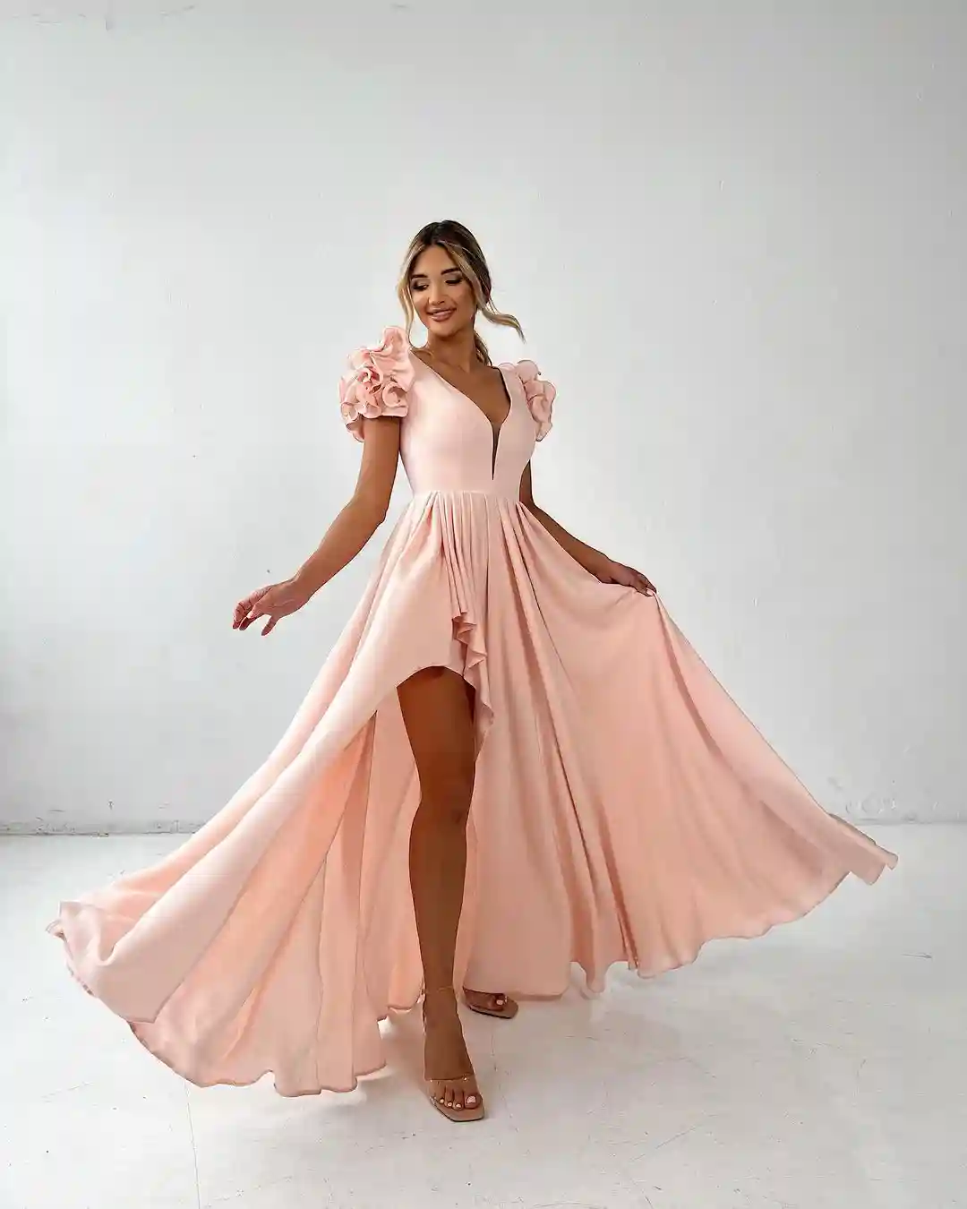 Elegancka sukienka w różu z asymetrycznym dołem i bufkami na ramionach - idealna na specjalne okazje.