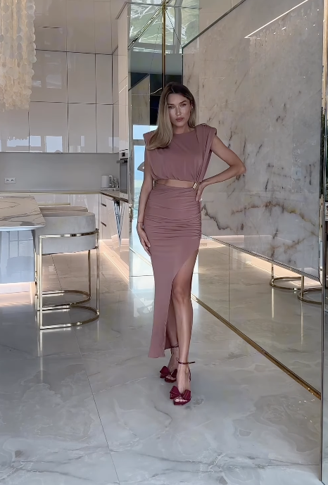 Sukienka o długości maxi z rozciągliwej tkaniny z draperiami. Posiada poduszki na ramionach i gumkę w pasie bluzki i spódnicy.