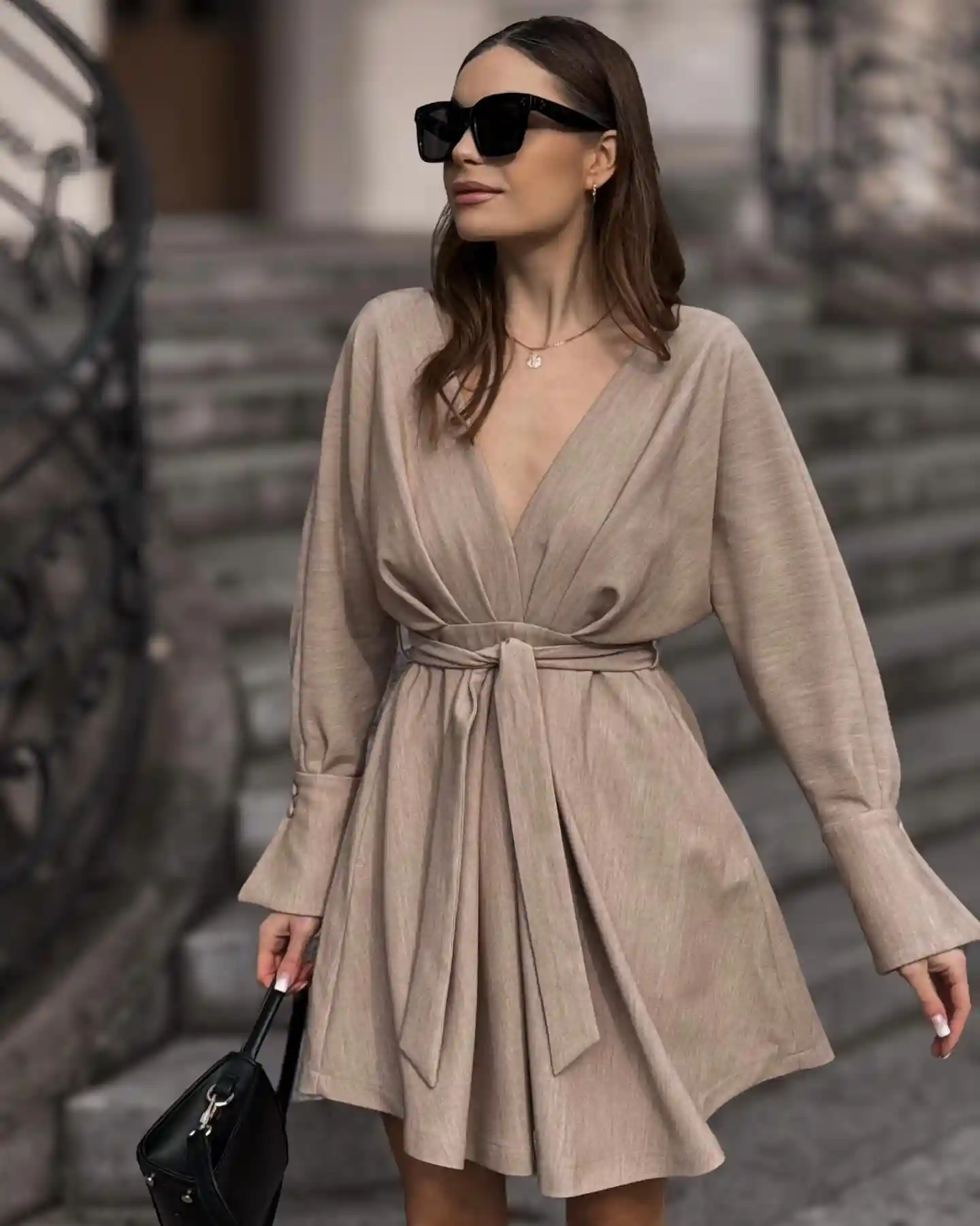 Sukienka SONIA w jasnym beżu, z głębokim dekoltem V. Posiada rozkloszowany dół, rękawy z mankietami na guziki, gumkę i pasek w talii oraz kieszenie boczne. Komfortowa i niezwykle elegancka.