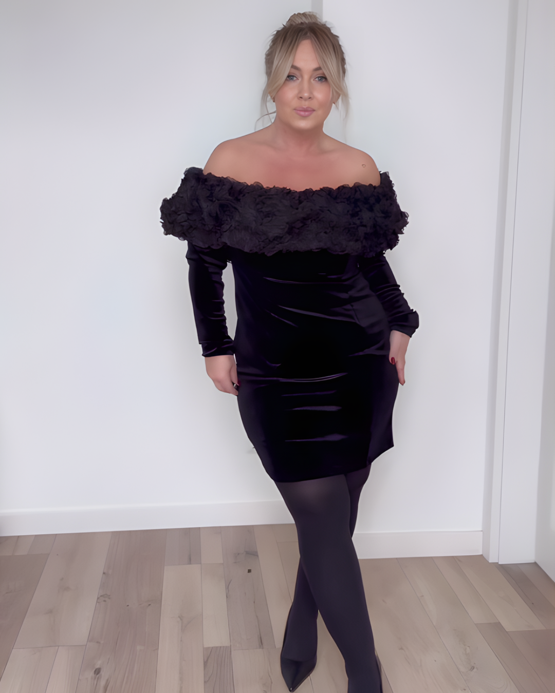 Czarna sukienka mini z kwiatowym zdobieniem. Wokół ramion została wszyta gumka. Wykonana z elastycznej tkaniny, zapinana na zamek z tyłu. Sukienka posiada dopinane ramiączka.