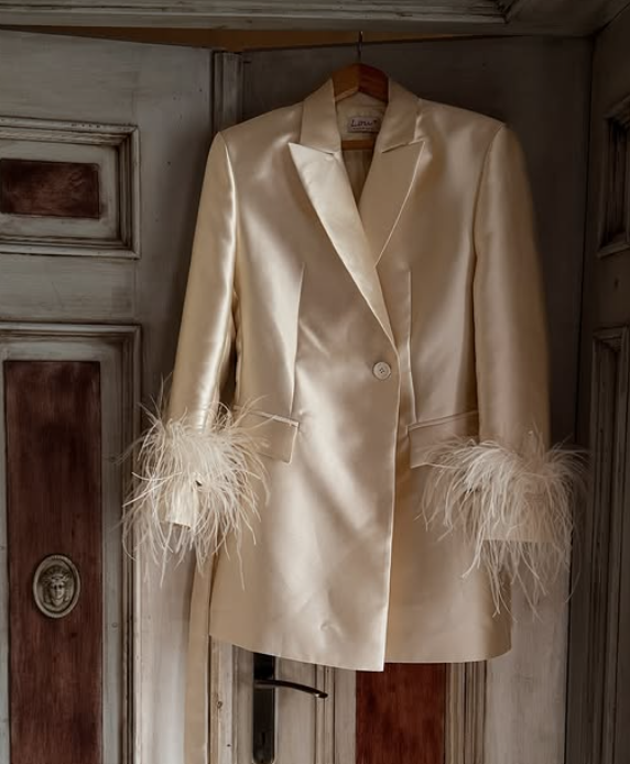 Sukienka z usztywnianej tkaniny. Zapinana na logowane guziki. Z tyłu posiada gumki w talii, które umożliwiają regulację. Całość wykończona podszewką z wiskozy. Pióra na dole rękawa są odpinane. Sukienka występuje w dwóch wariantach.