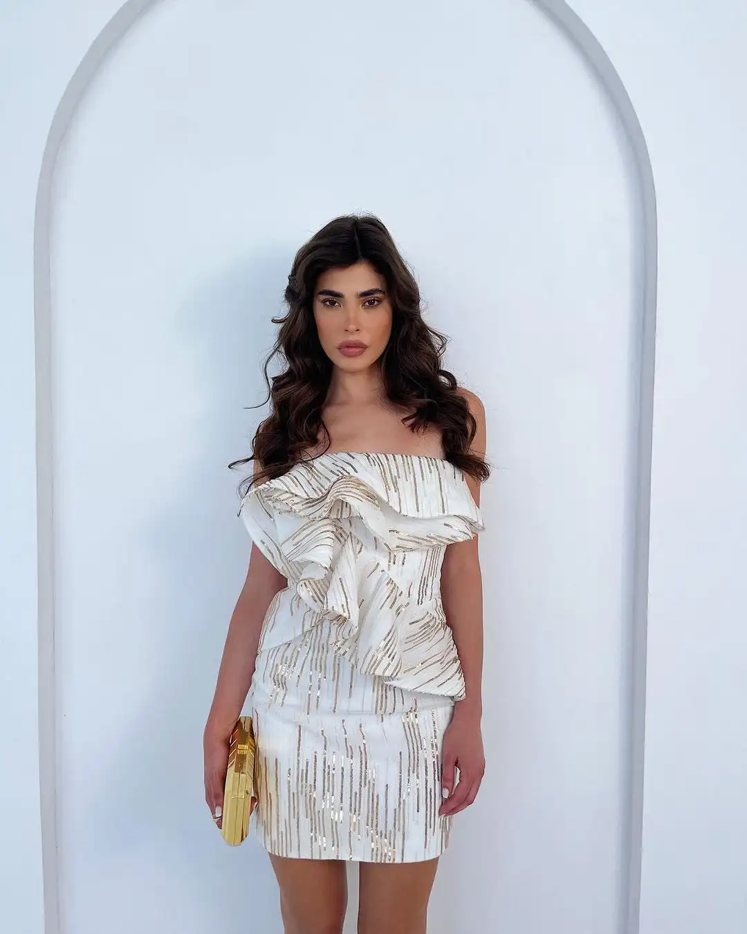 Zoila - Olśniewająca biała sukienka mini ze złotymi cekinami